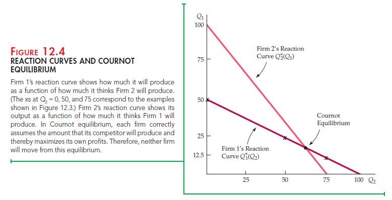 Figure 12.5 shows the firms’ reaction curves and this Cournot equilibrium. Note that Firm 1’s reaction curve shows its output Q1 in terms of Firm 2’s output Q2. Likewise, Firm 2’s reaction curve shows Q2 in terms of Q1. (Because the firms are identical, the two reaction curves have the same form. They look different because one gives Q1 in terms of Q2 and the other gives Q2 in terms of Q1.) The Cournot equilibrium is at the intersection of the two curves. At this point, each firm is maximizing its own profit, given its competitor’s output.