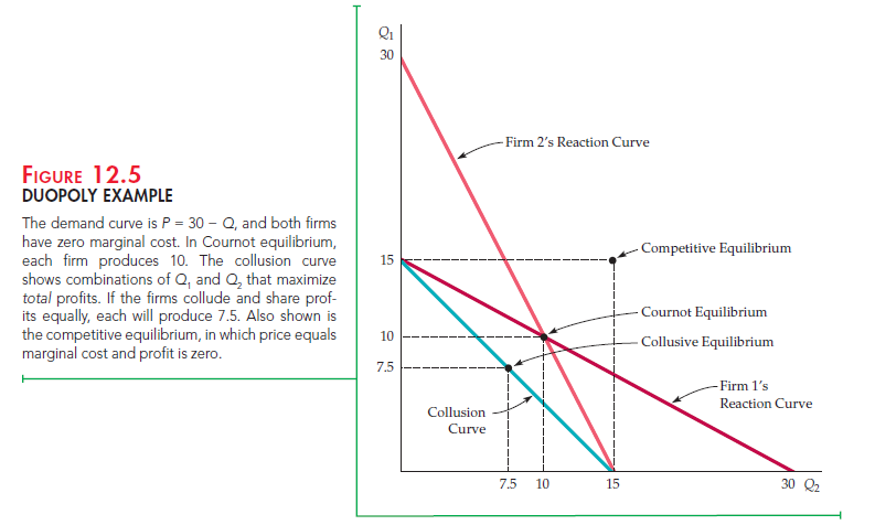 As you would expect, both firms now produce less—and earn higher prof- its (112.50)—than in the Cournot equilibrium. Figure 12.5 shows this collusive equilibrium and the competitive output levels found by setting price equal to marginal cost. (You can verify that they are Q1 = Q2 = 15, which implies that each firm makes zero profit.) Note that the Cournot outcome is much better (for the firms) than perfect competition, but not as good as the outcome from collusion.