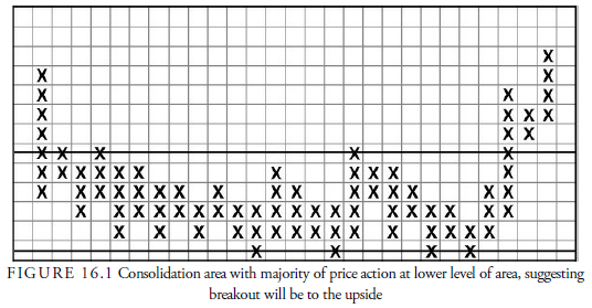 One observation, for example, is that when price changes occur more frequently at the lower level of a consolidation area, the odds favor a breakout to the upside. The converse is true when price changes occur frequently at the upper level of consolidation. Because one-box charts plot so much information, the consolidation areas are often very wide, being made up of many smaller price oscillations, just as in a bar chart. The important point in analyzing point and figure charts is to consider the consolidation area as a whole and ignore the smaller separate parts. The analyst must determine where the price change work has been done, either in the lower or upper level of the area, and place more emphasis on recent work than on past price changes. Figure 16.1 is an example of a one-box reversal chart with price action predominately in the lower level of the consolidation and a subsequent breakout upward.