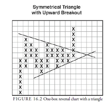 Trend lines are drawn on a one-box reversal chart just as they are on a bar chart, connecting highs to highs and lows to lows. These lines frequently outline standard patterns that we have seen in bar chart analysis, such as triangles, rectangles, broadening formations, wedges, and even flags and pennants. The same type of analysis used with bar charts can be applied to one-box reversal charts. Figure 16.2, for example, shows a one-box reversal chart with a triangle formed by two trend lines.