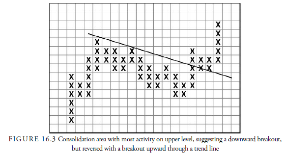 In consolidation areas, the one exception to the rule about where the majority of price changes occur, suggesting the direction of the breakout, is when a trend line is penetrated in the opposite direction from that which is developing as the most likely. Figure 16.3 shows an example of a consolidation area with the most recent and majority of action occurring at the upper end of the area, suggesting a breakout downward. However, this suggestion was negated when prices broke above the trend line.