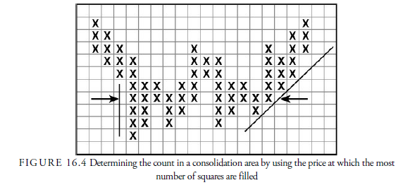 The count is calculated by counting the squares across a consolidation area. As shown in Figure 16.4, the price level in the consolidation area that has the most squares filled is used for the count. The count includes all squares along a horizontal price line from the left to the right of the consolidation area, including any blank squares that might occur. When each side of the consolidation is a vertical line of some proportion, called a wall, the determination of where to locate the horizontal line from which the count is determined is relatively easy. In most cases, a wall does not exist, however, and the analyst must judge along what price line in the consolidation the most number of filled squares occur. Figure 16.4 shows a consolidation with the left side being a wall that is relatively easy to determine, the right side with a more difficult configuration, and where the count might be applied. When the consolidation is irregular, the analyst must determine from experience with counts what the best price level to use would be.