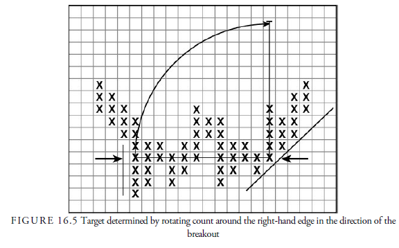 Once the count is determined, the distance of the count is then added to the right-hand square with the last entry in the consolidation area. This is the standard method, although there are variations. The result is as if the count line was rotated upward or downward around the last square in the count (see Figure 16.5). The resulting price level projected from the distance of the count is the objective for the next price move. It is surprising how accurate this method can be, but, of course, it should never be depended upon solely. Other factors such as market direction, change in supply or demand, or other informational changes can affect the eventual price target. It is only an approximation.