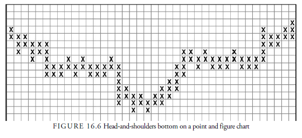 Many of the patterns observed in bar charts also occur in one-box charts. The most common is the head and shoulders pattern (see Figure 16.6), but the rounded, double, and triple formations are also seen. The implications of these patterns are the same as in bar charts, except that with the ability of the count to estimate a price target, the patterns are more easily assessed for reward versus risk. One-box reversal charts also have a few patterns of their own.