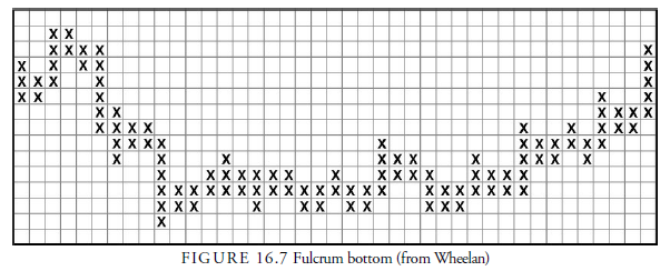 The fulcrum is a distinctive one-box reversal chart pattern. Indeed, some analysts call all reversal patterns fulcrum, just as they call continuation patterns “semi-catapults.” The fulcrum is easily recognized, occurs at both tops and bottoms, and gives a reliable count because distinct walls usually contain it. Common characteristics in the fulcrum bottom (see Figure 16.7) are the following: