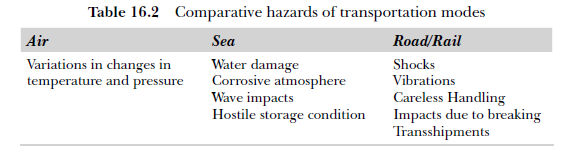 In India, among all the transportation modes, air accounts for less than one per cent of the total cargo movement, while rail contributes to 35 per cent, road 39 per cent and sea 24 per cent. Each of the modes is associated with some hazards and so there is no ideal mode of transportation (see Table 16.2). The choice depends on the urgency at the customer end and affordability of the costs involved.