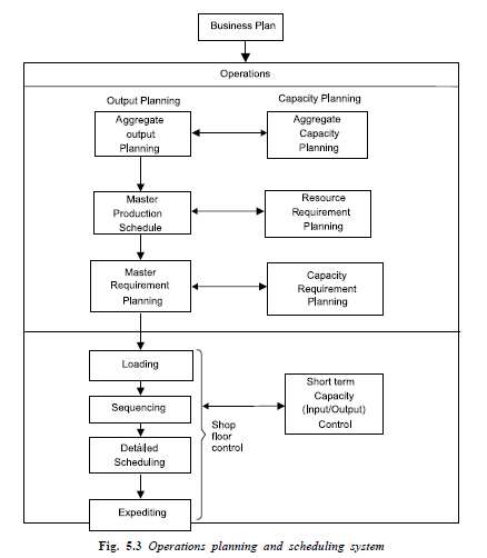 Operations planning and scheduling systems concern with the volume and timing of outputs, the utilisation of operations capacity at desired levels for competitive effectiveness. These systems must fit together activities at various levels, form top to bottom, in support of one another, as shown in Fig. 5.3. Note that the time orientation ranges from long to short as we progress from top to bottom in the hierarchy. Also, the level of detail in the planning process ranges from broad at the top to detail at the bottom.