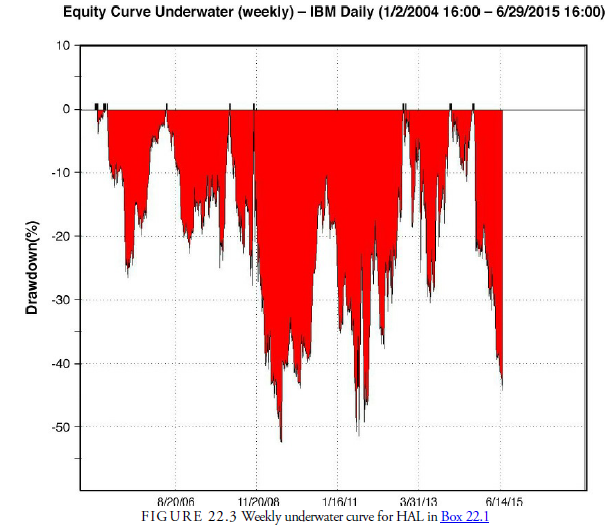 The second type of graph used to look at system performance is the underwater curve chart. An example of this type of chart is shown in Figure 22.3. This displays the drawdown from each successively higher peak in equity. It is calculated in percentages and gives a representation not only of how much drawdown occurred, but also of how much time passed until equity recovered from that drawdown. As Figure 22.3 shows, the maximum percentage drawdown in the initial HAL system was a little over 90% of the original capital of $30,000. This chart helps us see that a major problem with the system is not only the size of the drawdowns but also the time it takes for the system to recover. In Box 22.2, we outline a method for improving the system.