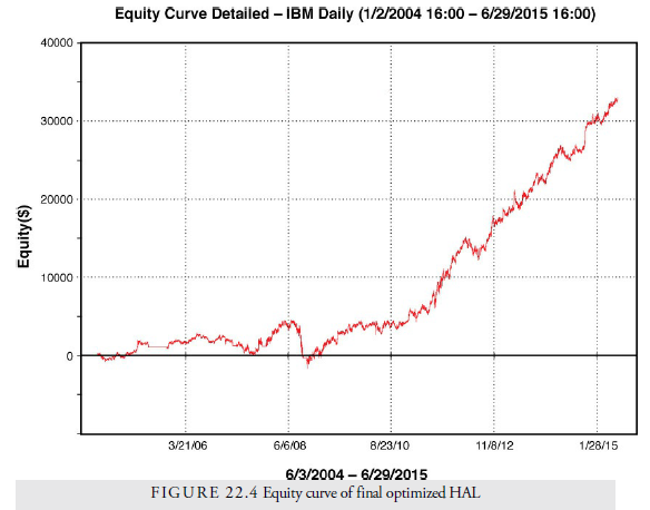 The changes made to HAL are threefold. First, we include a filter that will prevent the system from trading when the market is dull. We do this using a requirement that the ADX be higher than its predecessor some unknown number of days prior. We use the ADX because it is a measure of trend and we don’t want to play if there is no trend. There are other configurations of the ADX as a filter, but this is the one that worked best with HAL. Second, we add a percentage protective stop to lower the number of losses that accumulated time and loss while waiting for a buy signal. Third, we run optimizations on the parameters of ADX length, ADX lookback, CCI length, and upper and lower signal levels. The optimal results, using the perfect profit correlation as the objective function, were then run through a walk- forward optimizer to see which combination of parameters has the most likely chance of profiting in the next year.