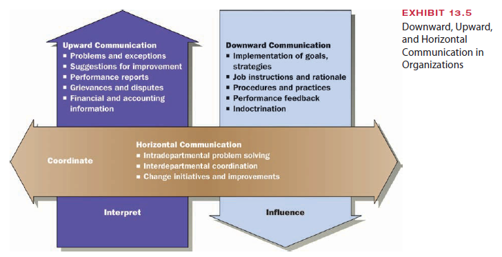 Formal communication channels flow within the chain of command or task responsi- bility defined by the organization. The three formal channels and the types of information conveyed in each are illustrated in Exhibit 13.5.38 Downward and upward communications are the primary forms of communication used in most traditional, vertically organized companies. However, many of today’s organizations emphasize horizontal communica- tion, with people continuously sharing information across departments and levels.