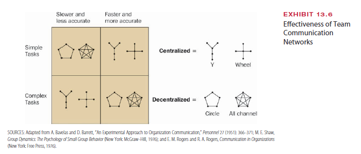 Research into team communication has focused on two characteristics: the extent to which team communications are centralized and the nature of the team’s task.50 The rela- tionship between these characteristics is illustrated in Exhibit 13.6. In a centralized network, team members must communicate through one individual to solve problems or make decisions. In a decentralized network, individuals can communicate freely with other team members. Members process information equally among themselves until all agree on a decision.51