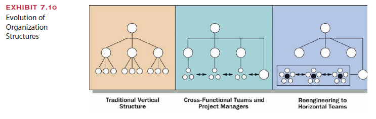 Reengineering frequently involves a shift to a horizontal team-based structure, as de- scribed earlier in this chapter. All the people who work on a particular process have easy access to one another so they can easily communicate and coordinate their efforts, share knowledge, and provide value directly to customers.62 For example, reengineering at Texas Instruments led to the formation of product development teams that became the funda- mental organizational unit. Each team is made up of people drawn from engineering, mar- keting, and other departments, and takes full responsibility for a product from conception through launch.63