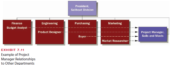 In some organizations, project managers are included on the organization chart, as illustrated in Exhibit 7.11. The project manager is drawn to one side of the chart to indi- cate authority over the project but not over the people assigned to it. Dashed lines to the project manager indicate responsibility for coordination and communication with assigned team members, but department managers retain line authority over functional employees.