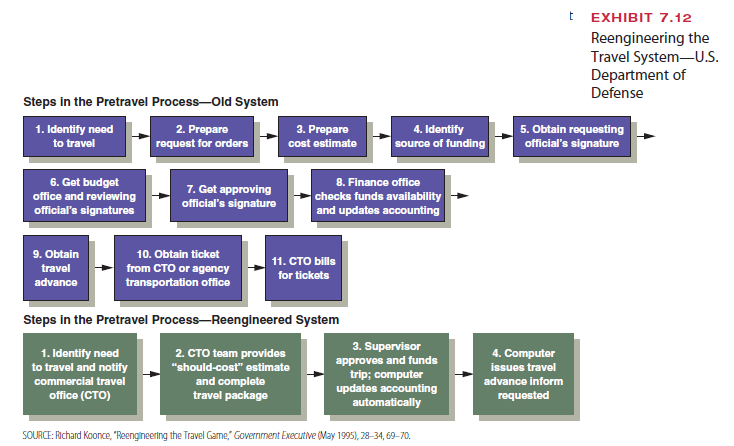 Reengineering can also squeeze out the dead space and time lags in work flows, as illustrated by reengineering of the travel system at the U.S. Department of Defense.