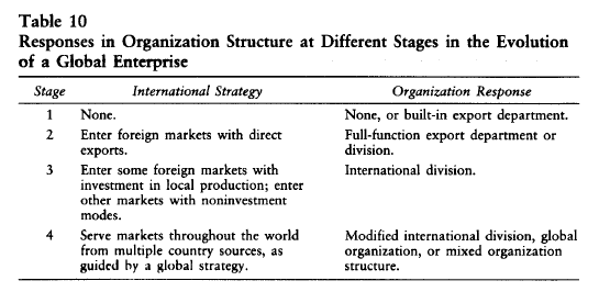 As an enterprise becomes more international, its organization structure also evolves in response to shifts in international strategies. Table 10 indicates the most common organization structures at different stages of the evolutionary scheme first introduced in Table 3 in Chapter 1.
