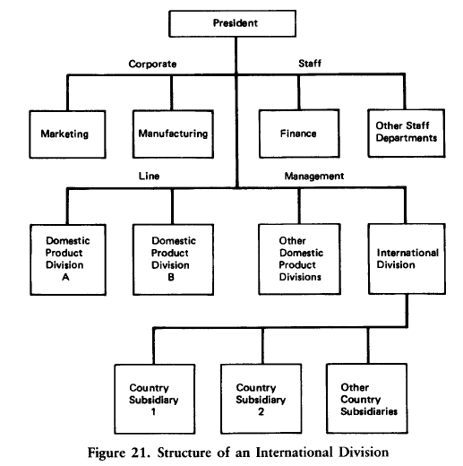 Most multiproduct U.S. companies are already organized by domestic product divisions when they make their first overseas investments in foreign production. The most common organizational response to this new strategy, therefore, is the creation of an international division at the same corporate level as the domestic product divisions.2 This form of organization is depicted in Figure 21.