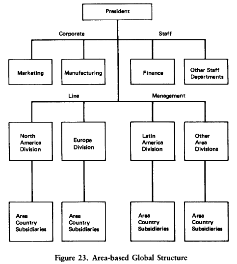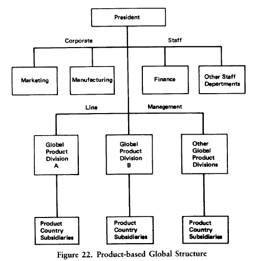 With the product-based global structure, the vice presidents of the respective product divisions become responsible for the production and marketing of their products throughout the world. These operating divisions are supported by corporate staff departments that now have a global responsibility for their functions. Hence the product-based global structure enables an enterprise to undertake worldwide strategies for diverse product lines. Country subsidiaries report directly to a corporate product division, from which they receive product and technical information and skills. In brief, this structure encourages a concentrated focus on product strategies that cover the world. …….