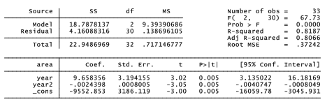 . regress area year c.year#c.year
