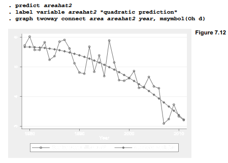 For illustration, we return to the trend in Arctic sea ice (Arctic9.dta). Residual analysis in the previous section suggests that a linear model, Figure 7.9, is not appropriate for these data. One simple alternative termed quadratic regression involves regressing the dependent variable on both year and year squared. We could start by generating a new variable equal to year squared: