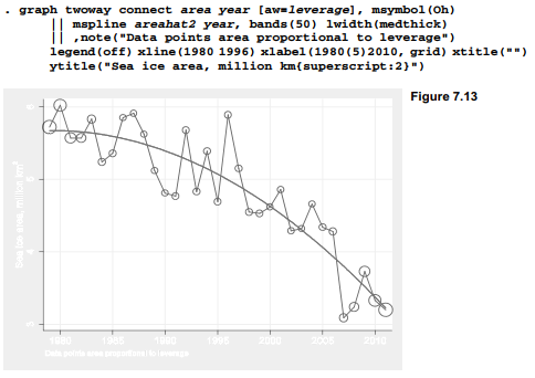 Figure 7.13 draws the quadratic regression curve again, this time making the area of connect marker symbols proportional to leverage by specifying analytical weights, [aw=leverage]. This graph also overlays a median spline plot (mspline) which draws a smooth curve connecting the predicted values areahat2. Median spline plots often serve better than line or connected-line plots to graph a curvilinear relationship. For this purpose it helps to specify a large number of bands(); type help twoway mspline for more about this twoway plot type.