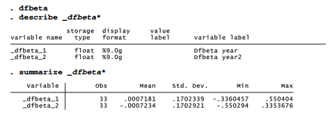 a single predictor through a predict new, dfbeta(xvarname) command. DFBETAS for all of the predictors in a model are obtained more easily by the dfbeta command, which creates a new variable for each predictor. In our example there are two predictors, year and year2. Consequently the dfbeta command defines two new influence statistics, one for each predictor.