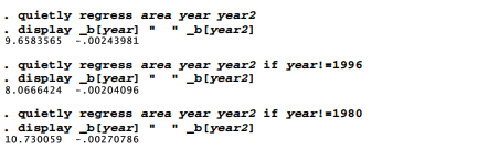 If we were unsure about how to read DFBETAS, we could confirm our interpretation by repeating the regression with influential observations set aside. To save space, quietly here suppresses the regression output, and we ask only to display the coefficients on year and year2, separated by two blank spaces for readability. The first regression employs the full sample. The second sets aside 1996, which makes the coefficient on year lower (from 9.658 to 8.067) and the coefficient on year2 higher (from -.0024 to -.0020). Setting aside 1980 in the third regression has an opposite effect: the coefficient on year becomes higher (9.658 to 10.730) and the coefficient on year2 becomes lower (-.0024 to -.0027).