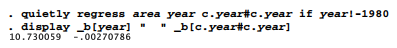 Two alternative ways to conduct the same quadratic regression, without first generating a new variable for year squared, would be to use Stata’s interaction (#) notation. All three of the following commands estimate the same model. Either of the # versions would be needed for a subsequent margins command to work properly.