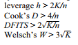 The reasoning behind these cutoffs, and the diagnostic statistics more generally, can be found in Cook and Weisberg (1982, 1994), Belsley, Kuh and Welsch (1980) or Fox (1991).