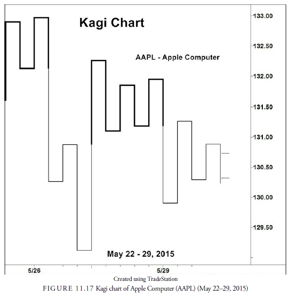 Similar to a point and figure chart in philosophy, the Kagi chart is an old Japanese version of charting that is independent of time and only plots when a change of direction occurs by a specific amount. Figure 11.17 shows a representation of Apple Computer (AAPL) over one week with a reversal amount of 0.5 points. This chart uses only high and low prices but can include just closes, usually in a longer-term chart. Reversal amounts traditionally were percentages, which can still be used, but today points or an average true range (ATR) (see Chapter 13, “Breakouts, Stops, and Retracements”) are the most common.