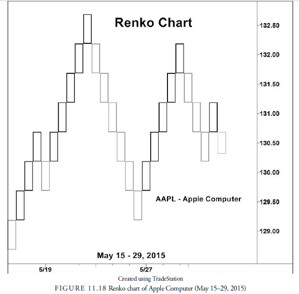 The Renko chart, also of Japanese origin, avoids time and changes direction by specific amounts. Unlike point and figure or Kagi, the plot is composed of “bricks” plotted on end with only one brick per column. The brick is a standard width, and the height is based on the reversal amount specified. For example, as shown in Figure 11.18, the chart of Apple Computer again uses a 0.5 reversal amount. The first plot, on the closing plot from the day before, is 129.20. Every subsequent brick is then plotted based on 0.5 intervals from that 129.20. The following day, the first move of 0.5 points was downward, causing a downward brick that extended to 128.70. The price may have declined further, but not more than another 0.5 or another brick would have been drawn. At that point, the price can either continue downward and be recorded for every 0.5 amount it declines, or it can rise 0.5 above the top of the brick at 129.20. If it rises 0.5 above that level to 129.2, another brick is placed in the next column to the right.
