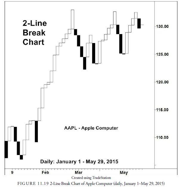 The line-break chart is just another Japanese method of avoiding the time interval in price action and focusing only on the price action itself. Like the others in this category, the plot depends on a reversal in price. Rather than use a specific price amount to distinguish the reversal, the 2-Line, Line-Break chart uses the previous two lines for its reference point. A line is a block-type bar similar to that used in a candlestick chart as the body. The width of the line is constant, based on the chart, and the height is based on the price change relative to the previous lines. Only closing prices are used. Thus, in Figure 11.19, the first bar is the close of the first day relative to the close of the earlier day. It was downward from the previous close and thus is colored black and marked on the chart as a black line. The next day the market rallied and a white line for “up” is recorded. From now on, only a close that has exceeded two block lows can be recorded as a reversal. If it is not a reversal, it is either within the range of the two prior lines and is thus not recorded, or it is up from the last close and is thus recorded as another white line. The fourth line is a black line because it closed below the lows of the prior two up lines. The trend is now downward, and only a cross above the most recent 2-line highs can cause a reversal upward. Thus, each day may or may not have a line drawn in it depending on its close versus the previous two lines if in the opposite direction or in addition to the line in the same direction. A 3-line break chart is constructed in the same manner but must break three previous lines to record a trend reversal. Signals can occur from conventional, classic patterns, support or resistance breaks, or reverses in direction.