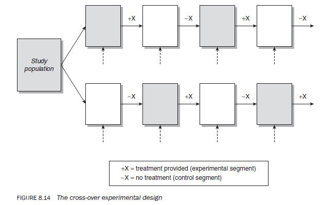 In the cross-over design, also called the ABAB design (Grinnell 1993: 104), two groups are formed, the intervention is introduced to one of them and, after a certain period, the impact of this intervention is measured. Then the interventions are ‘crossed over’; that is, the experimental group becomes the control and vice versa, sometimes repeatedly over the period of the study (Figure 8.14). However, in this design, population groups do not constitute experimental or control groups but only segments upon which experimental and control observations are conducted.