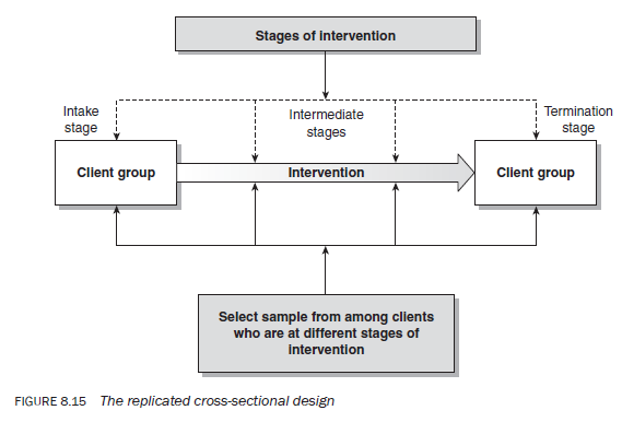 This design is based upon the assumption that participants at different stages of a programme are similar in terms of their socioeconomic-demographic characteristics and the problem for which they are seeking intervention. Assessment of the effectiveness of an intervention is done by taking a sample of clients at different stages of the intervention. The difference in the dependent variable among clients at intake and termination stage is considered to be the impact of the intervention.