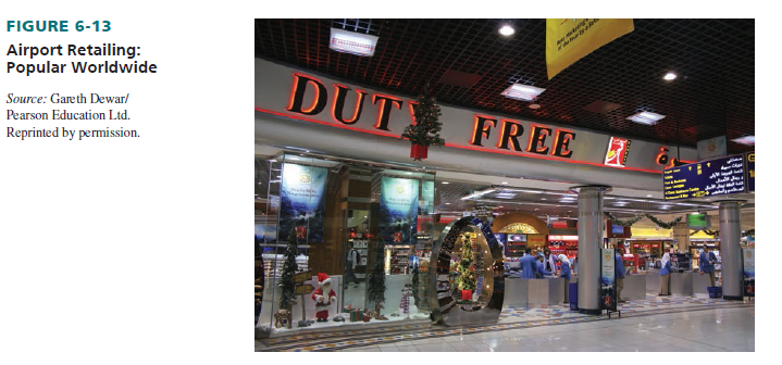 The potential retail market is huge. Worldwide, more than 1,200 commercial airports handle nearly 5 billion passengers each year—with North America accounting for one-third of global passenger traffic. U.S. airports alone fly millions of passengers each day and employ nearly 2 million people (who often buy something for their personal use at the airport). There are more than 400 primary commercial U.S. airports. Overall, airport retailing generates $45 billion in global sales annually, and many airports generate annual retail revenues of at least $50 million.35 Retail sales at duty-free shops throughout the world are forecast to reach $74 billion in 2019. The largest categories of goods sold are personal care and drinks.36 See Figure 6-13.
