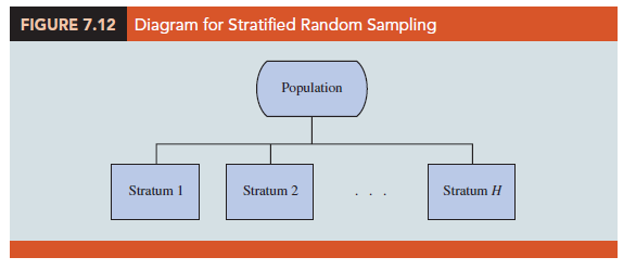 In stratified random sampling, the elements in the population are first divided into groups called strata, such that each element in the population belongs to one and only one stratum. The basis for forming the strata, such as department, location, age, industry type, and so on, is at the discretion of the designer of the sample. However, the best results are obtained when the elements within each stratum are as much alike as possible. Figure 7.12 is a diagram of a population divided into H strata.