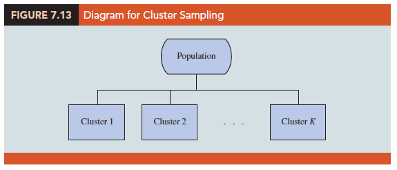 In cluster sampling, the elements in the population are first divided into separate groups called clusters. Each element of the population belongs to one and only one cluster (see Figure 7.13). A simple random sample of the clusters is then taken. All elements within each sampled cluster form the sample. Cluster sampling tends to provide the best results when the elements within the clusters are not alike. In the ideal case, each cluster is a representative small-scale version of the entire population. The value of cluster sampling depends on how representative each cluster is of the entire population. If all clusters are alike in this regard, sampling a small number of clusters will provide good estimates of the population parameters.