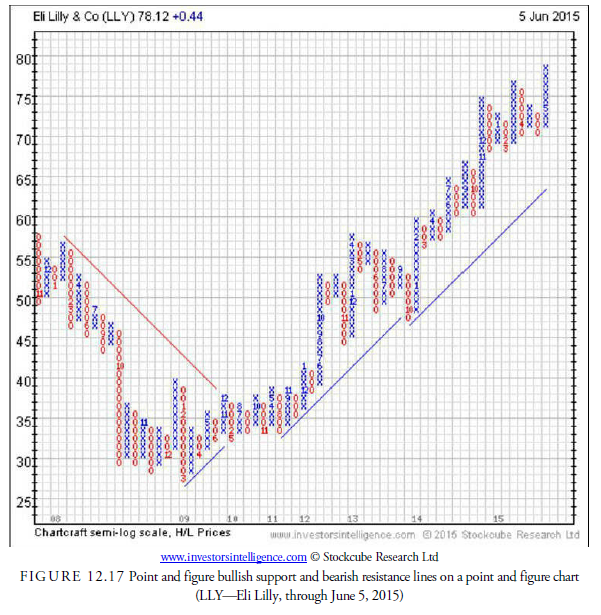 A trend line may be drawn between successive lows or highs in the standard, old-style, point and figure charts, just as they are drawn in a bar or candlestick chart. There is one variation, however, that occurs in the three-box reversal method. For this type of chart, trend lines are drawn at 45-degree angles (see Figure 12.17). Upward trend lines, called bullish support lines, are drawn at a 45-degree angle from the lowest low, and downward trend lines, called bearish resistance lines, are drawn from the last peak. These lines are not really trend lines in the sense that we have covered earlier, but price penetration through them has a specific meaning. We cover these in more detail in Chapter 16, “Point and Figure Chart Patterns.”