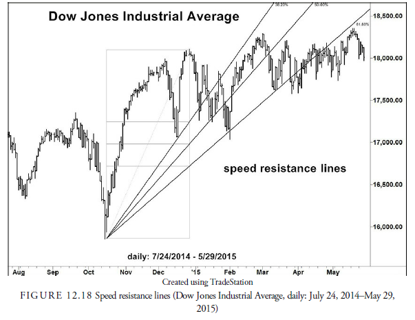 The late Edson Gould, an early proponent of technical analysis who did extensive market research, developed a means of estimating future support and resistance by what he called speed lines. Speed lines are calculated in the instance of an uptrend by taking the low point of the advance and the high point and creating a box whereby the low point is the lower-left corner and the high point is the upper-right corner (see Figure 12.18). Alternatively, during a downtrend, the beginning of the decline (the high point) is the upper-left corner of the box and the low point is the lower-right corner of the box. The vertical line from the high to the low straight down from the high is then marked at each third and at the halfway level, and a “speed” line is drawn from the actual low in the lower-left corner through each of the two marks on the right side and projected into the future. His hypothesis was that these speed lines were natural levels of support, and the prices would retrace to them. Modern methods have included marking the Fibonacci ratio numbers of 38.2% and 61.8% and drawing the speed lines through them. Because retracements do not seem to follow a consistent percentage, it seems doubtful that much merit should be applied to speed lines, but they are often seen in the literature on technical analysis.