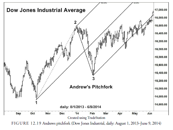 Developed by Dr. Alan Andrews, the pitchfork, in a downtrend (see Figure 12.19), takes the earliest high (1), the next minor low (2), and the first major retracement high (3) and then draws a line between the low and the retracement high (2-3). It then marks the halfway point on that line, draws a trend line through the earlier high and that mark, extending it into the future, and draws parallel lines to that new line from the minor low and from the retracement high. It sounds complicated, and like the speed line, apparently has limited value in projecting future support and resistance levels. Users claim that 80% of the time after the pitchfork is formed, prices will retrace to the middle line (1 – A). This has not been tested, however. The method is often seen in press articles, likely because of the name (similar to candlestick patterns that also have catchy names), but its usefulness is suspect.