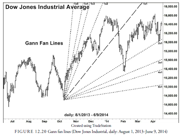 William Delbert Gann, known as W. D. Gann, was a famous commodities trader and book writer on trading tactics. He developed a number of technical methods (see Chapter 20, “Elliott, Fibonacci, and Gann”) that are still used by some practitioners. His invention of fan lines came from his belief that prices and time were related in a geometric pattern. To construct these lines, he used nine basic angles of trend lines based on the simple arithmetic relationship between the numbers 1, 2, 3, 4, and 8. By relating these numbers to a theoretical triangle beginning at an important price turning point, he could draw a series of trend lines that he thought had meaning. The angle of the trend line was always a ratio of the numbers converted into degrees. For example, he believed that 1 by 1 was the most basic ratio and converted into 45 degrees. From there to 1 by 2 was 63.75 degrees; 1 by 3 was 71.25 degrees, and so forth. Figure 12.20 shows the Gann fan lines drawn on the Dow Jones Industrial Average daily chart used earlier for the Andrew’s pitchfork. There is little statistical support for any of these methods, and you can see that the lines are similar regardless of the method used. There appears to be no foolproof method of anticipating trend lines. The best method is still to draw a line through the actual price data.