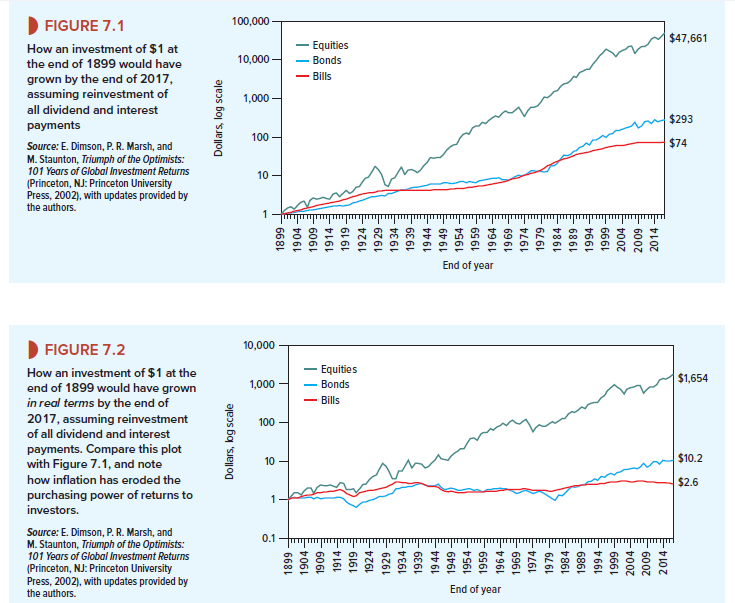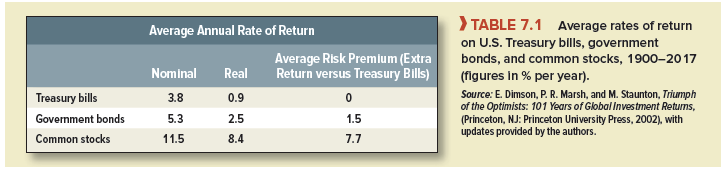 We can also calculate the rate of return from these portfolios for each year from 1900 to 2017. This rate of return reflects both cash receipts—dividends or interest—and the capital gains or losses realized during the year. Averages of the 118 annual rates of return for each portfolio are shown in Table 7.1.