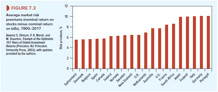 Figure 7.3 sheds some light on this issue. It is taken from a comprehensive study by Dimson, Marsh, and Staunton of market returns in 20 countries and shows the average risk premium in each country between 1900 and 2017. There is no evidence here that U.S. investors have been particularly fortunate; the United States was just about average in terms of the risk premium.