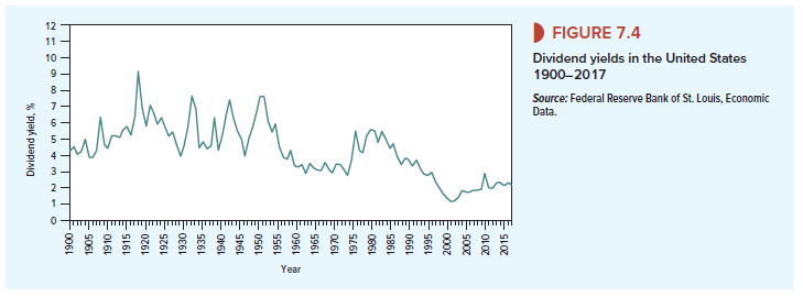 Figure 7.4 plots dividend yields in the United States from 1900 to 2017. At the start of the period, the yield was 4.4%. By 1917, it had risen to just over 10.0%, but from then onward, there was a clear, long-term decline. By 2017, yields had fallen to 1.9%. It seems unlikely that investors expected this decline in yields, in which case, some part of the actual return during this period was unexpected.[13]