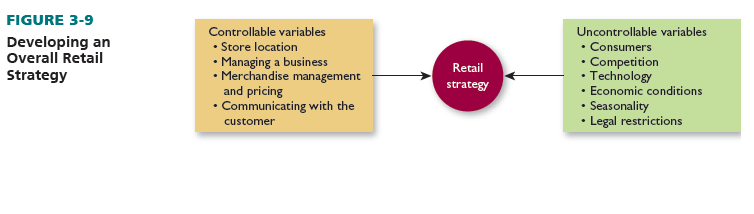 Next, a retailer develops an in-depth overall strategy. This involves two components: the aspects of business the firm can directly affect and those to which the retailer must adapt. The former are called controllable variables, and the latter are called uncontrollable variables. See Figure 3-9.