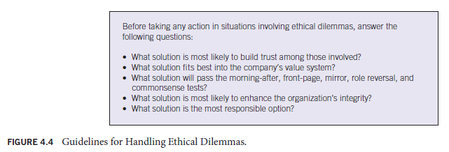 Every manager will eventually confront an ethical dilemma. When this happens, the manager’s response is very important. Figure 4.4 provides guidelines that managers can use in such situations.