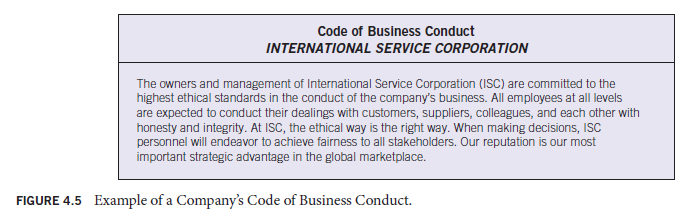 Ethics training should not take place in a vacuum, nor should it be nothing more than a list of “thou shalt nots” Rather, organizations should develop codes of business conduct written from a positive perspective that encourage employees to do the right thing. Figure 4.5 is an example of one organization’s code of business conduct.