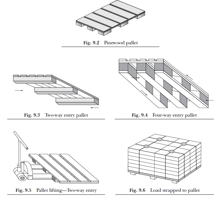 Palletization offers tremendous advantages in transportation and handling of the goods. The pallet gives better stability to goods during transportation in terms of damage protection as compared to individual handling of the master cartons. It enhances the productivity of the logistical system and reduces the cost of handling. Due to the standardization of pallet sizes conforming to the international standard, loading and unloading operations have become very easy. There are two-way or four-way entry pallets, the choice of which depends on method of storage, handling and transportation. The two-way pallets are handled by forklift from two sides, while four-way pallets have greater flexibility in being handled by forklift (Figures 9.2-9.6).