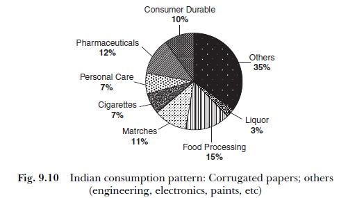The present consumption of corrugated boards in India is to the tune of 3,20,000 tonnes per annum, which is divided among above industries. Largest consumer is the food processing industry.
