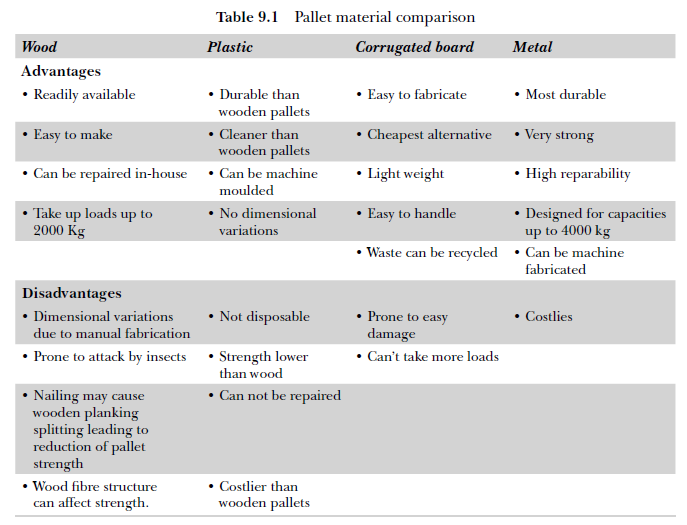 Wood is the most common material used for construction of pallets or crates. The pallets are designed to take loads up to 2,200 kilogram using hard wood. Soft wood may be used for weight carrying capacity up to 2,000 kilogram. The wooden pallets are cheaper as compared to metal or plastic pallets (Table 9.1).