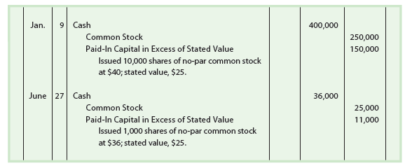 To illustrate, assume that in the preceding example the no-par common stock is assigned a stated value of $25. The issuance of the stock on January 9 and June 27 is recorded as follows: